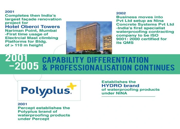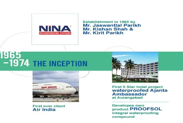 - 2002: Business moves into Pvt. Ltd setup as Nina Concrete Systems Pvt. Ltd.- India's first specialist waterproofing contracting company to be ISO 9001:2000 certified for its QMS.