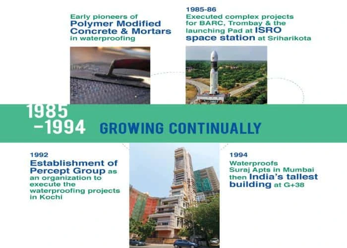 - 1992 – Percept Group was established as an organisation to execute the waterproofing projects in Kochi.
