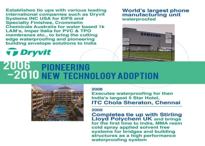 2015– Expanded technological expertise with High Performance Spray applied solutions like Polyurea, 2 K PU and Spray applied PUF insulation cum waterproofing.