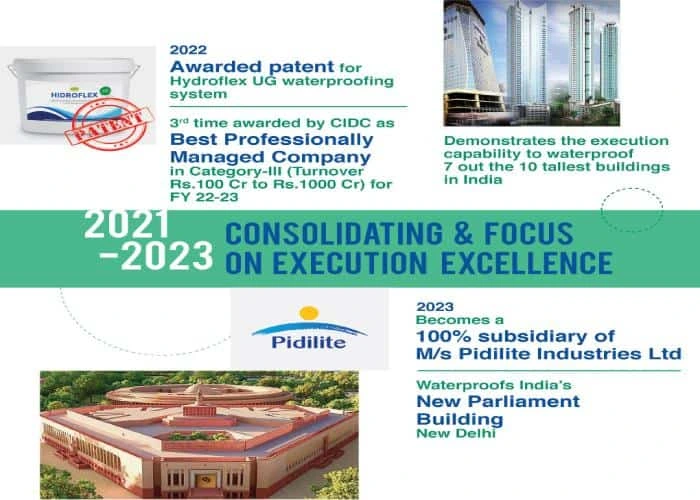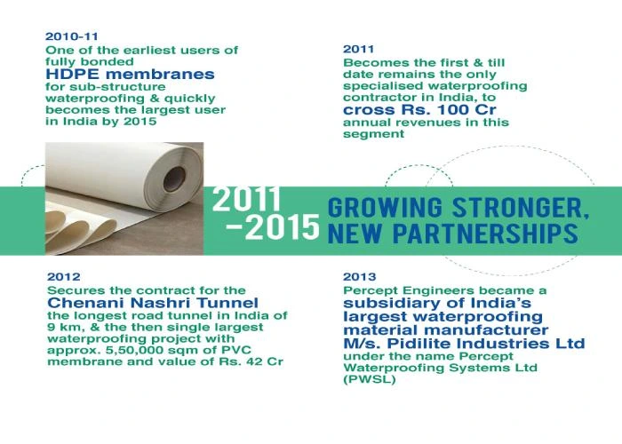 2013 – Percept Engineers became a subsidiary of India’s largest Waterproofing Material Manufacturer M/s. Pidilite Industries Ltd. under the name Percept Waterproofing Systems Ltd. (PWSL).