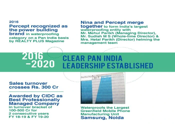 - Nina and Percept merge together to form India’s Largest Waterproofing entity with Mr. Mehul Parikh (Managing Director) and Mr. Sudish M S (Whole time Director) and Mrs. Hetal Parikh (Director) helming the management team.